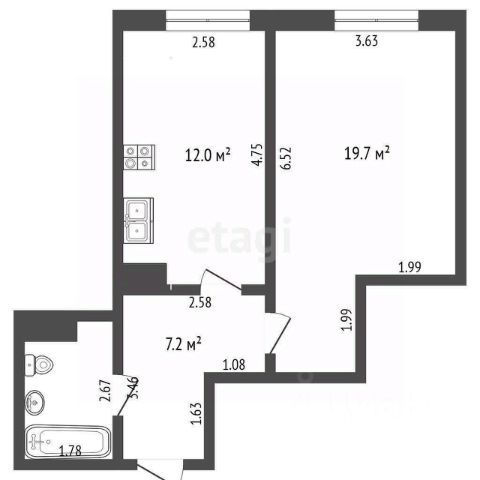 Площадь: 46 м² (жилая — 29,6 м², кухня — 7,59 м²)