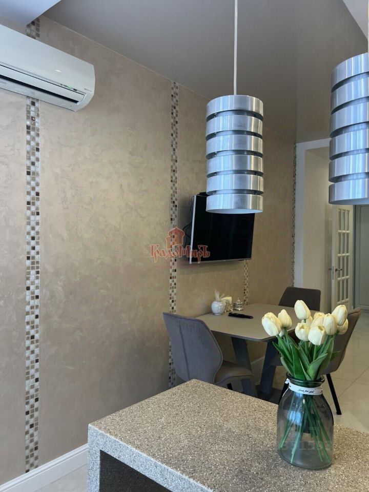 В квартире выполнен качественный дизайнерский ремонт с использованием современных и экологически чистых материалов: фактурная штукатурка на стенах, комбинированные натяжные потолки, полы из кварцвинила и плитки. Установлены красивые межкомнатные двери из массива дерева с остеклением и качественной фурнитурой, а также входная дверь TOREX. Выключатели и розетки — фирмы LEGRAND.