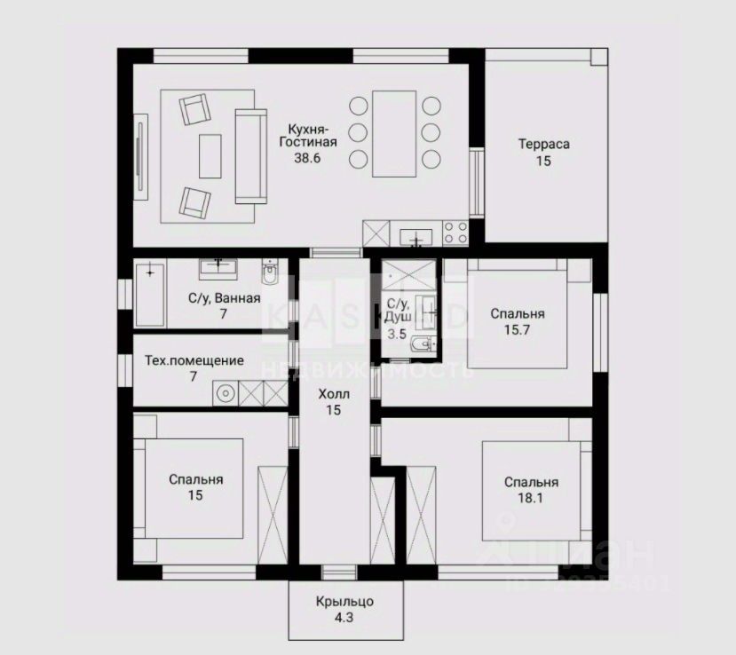 Кухня-гостиная-столовая единое пространство с выходом на террасу, мастер-спальня (хозяйская) со своим с/у, 2 спальни, су, бойлерная.